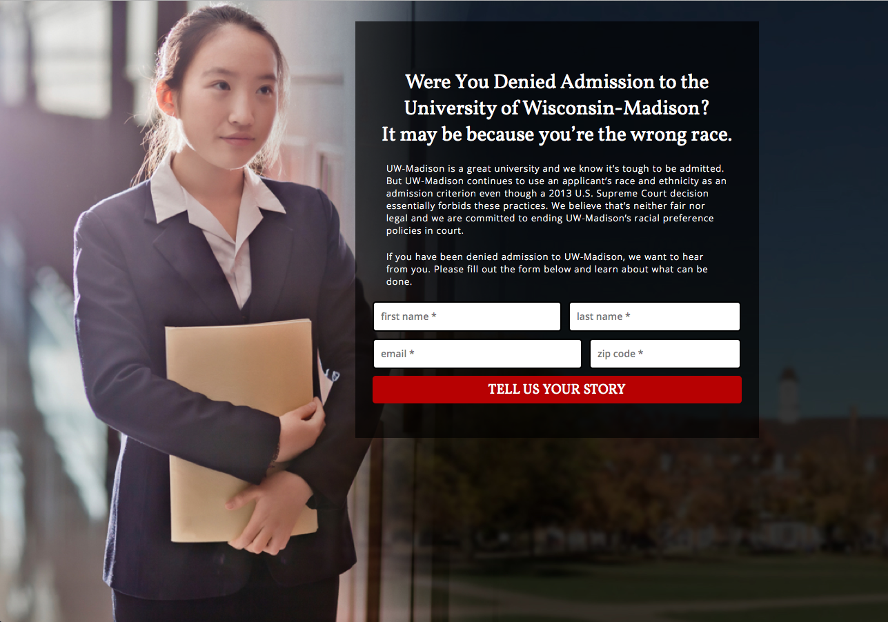The Project on Fair Representation, a legal defense fund backed by self-professed “charity” organization Project Liberty, Inc. is running smear web campaigns against the University of Wisconsin-Madison, University of North Carolina-Chapel Hill, and Harvard University over charges of “racial discrimination.” On the campaigns’ web pages, Asian faces are prominently displayed next to the tagline: “Were you denied admission? It may be because you’re the wrong race.” These campaigns claim that Asian Americans are subjected to racial quotas in college admissions and are unfairly rejected from some of the nation’s top universities. They play off the popular and yet unfounded idea that affirmative action hurts not only white students, but also Asian Americans.